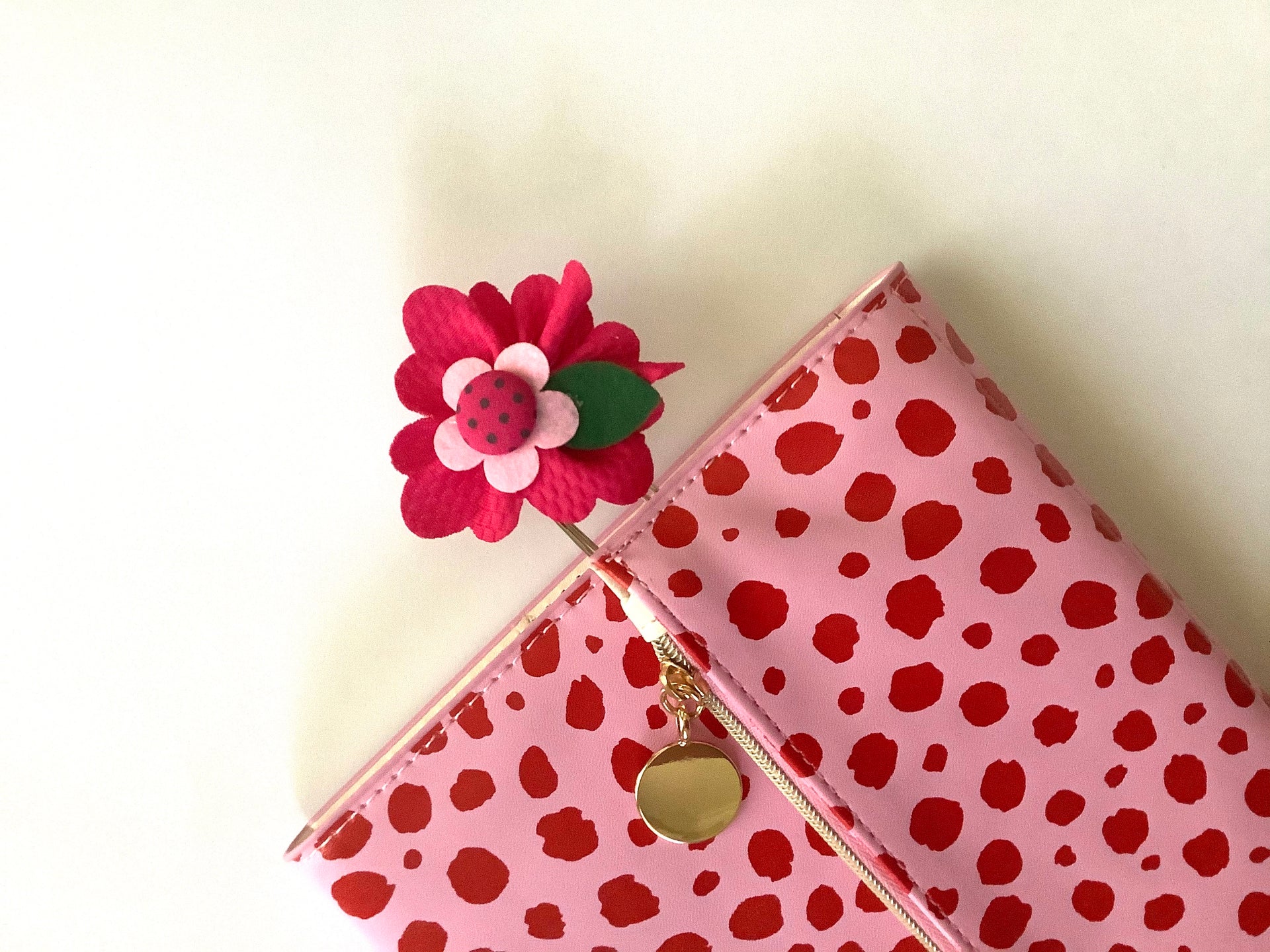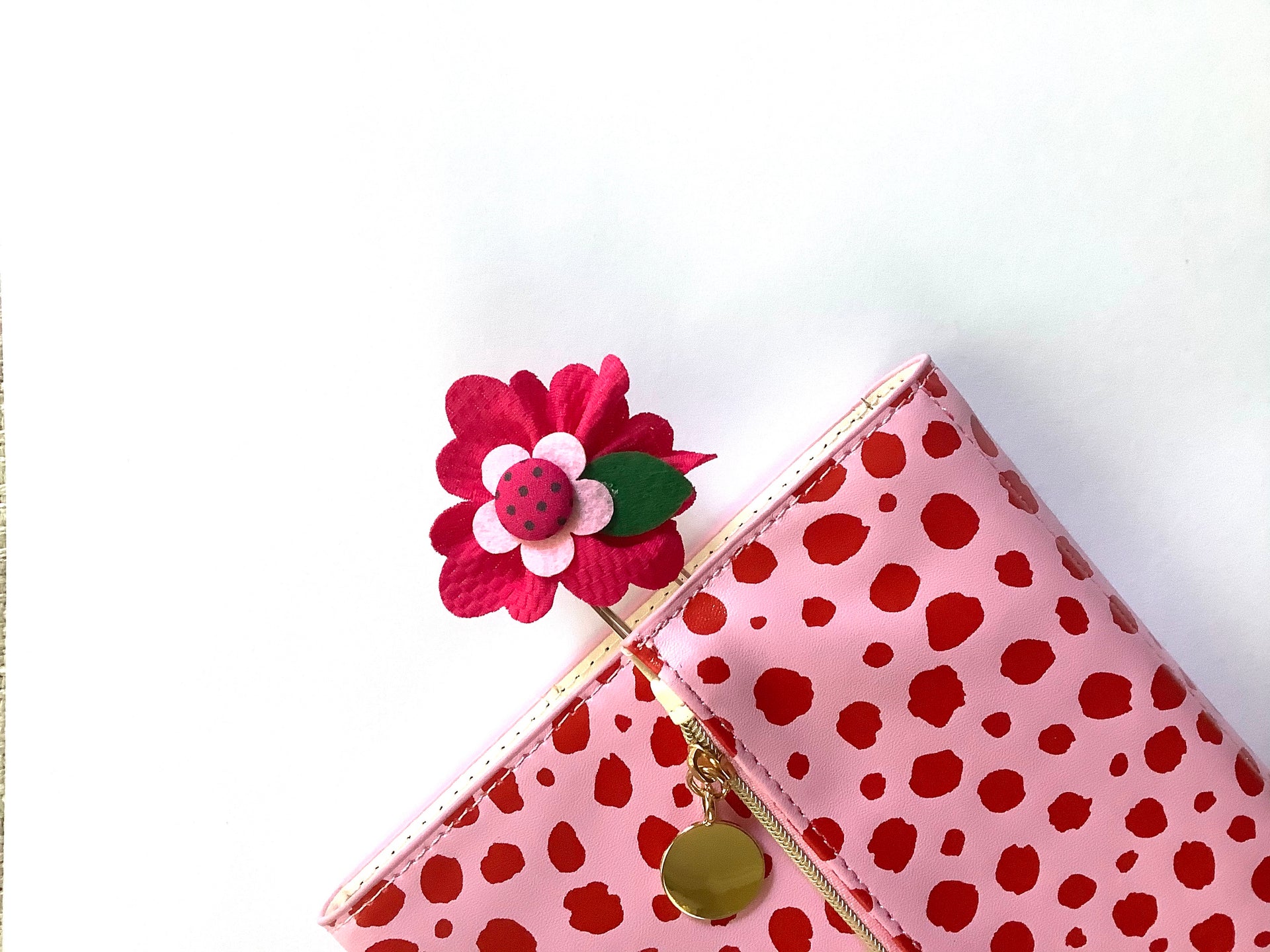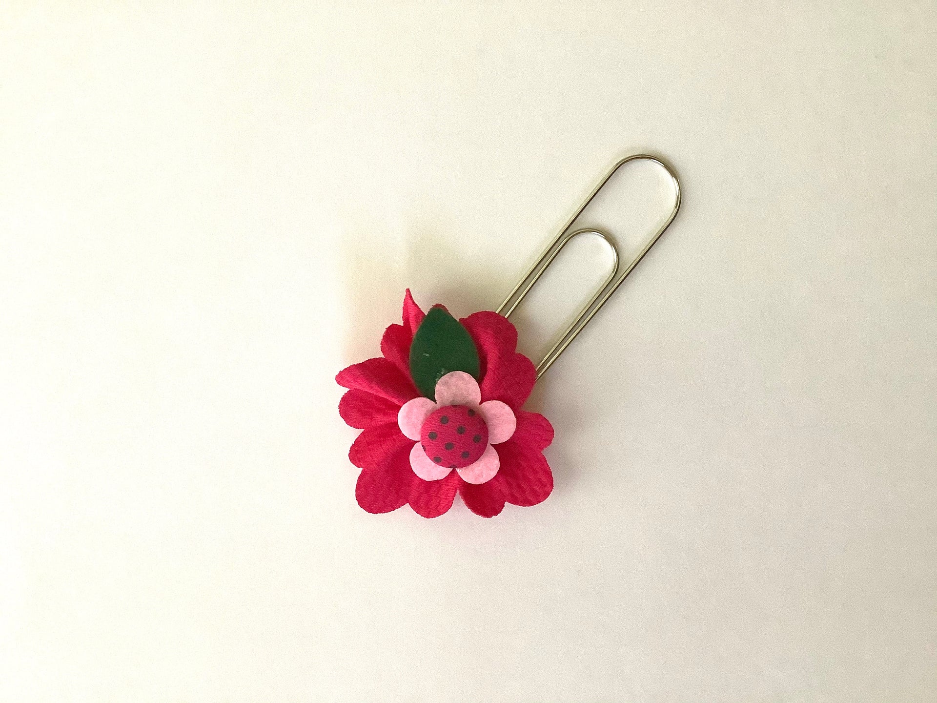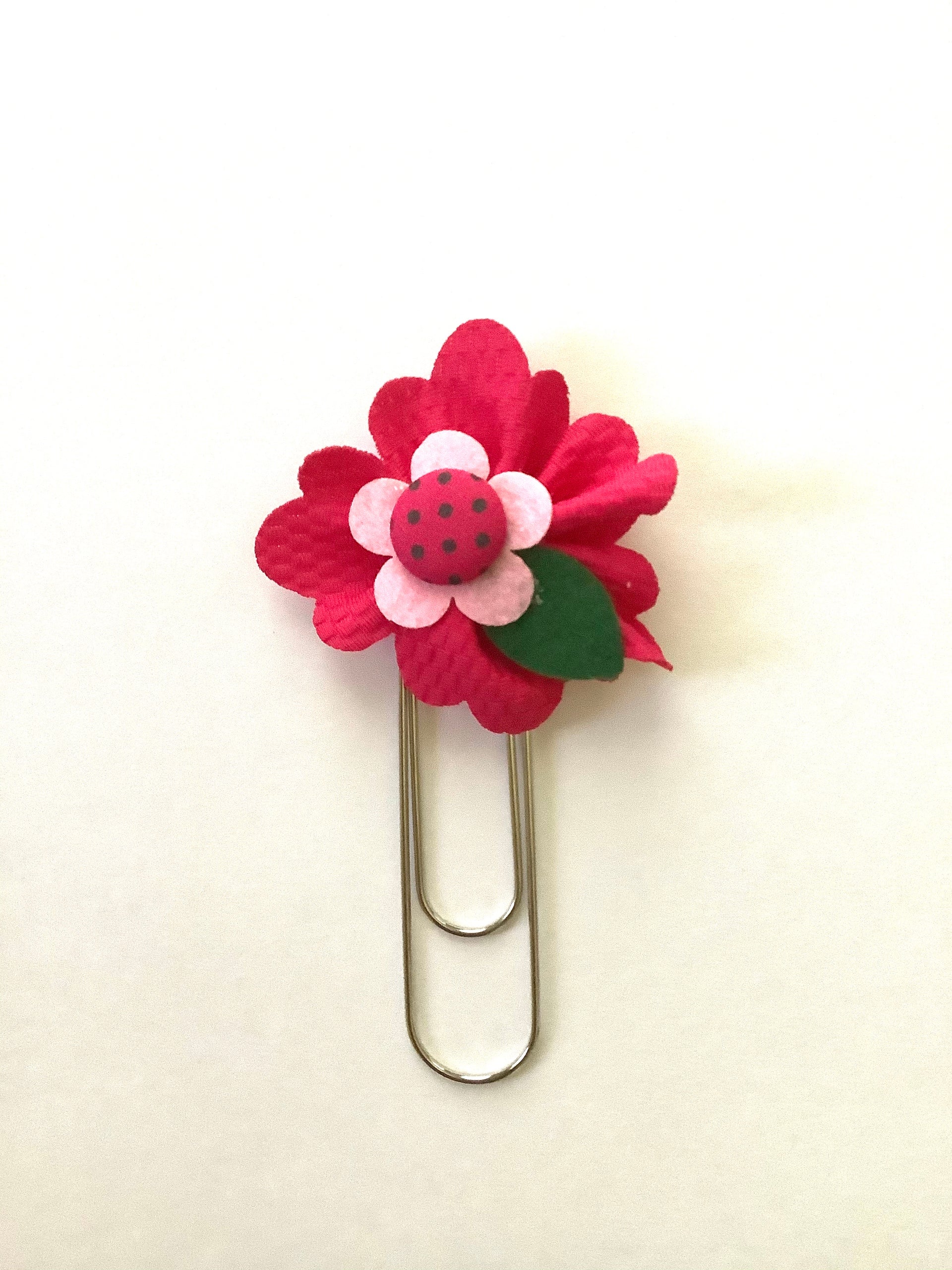 One Planner Clip. Made of hot pink fabric with a pink felt flower and button center. This extra large paper clip measures 4 inches long and will look great in your planner. It works well as a bookmark also. It comes beautifully packaged for gift giving. What a useful and unique gift.