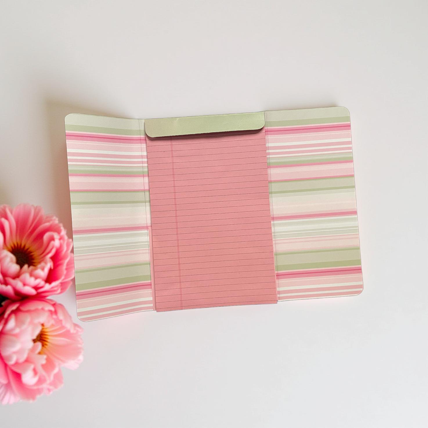 Wrapped in soft pink and green and finished with a pearl-kissed belly band, this notepad wallet turns everyday lists into moments of calm. With 80 lined sheets in a generous 5×8 legal size, plus an inside pocket for easy refills, it gives her space to plan, process, and move through her day with more clarity and grace.